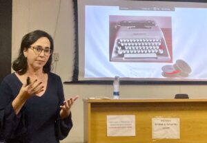 Em um dos slides, uma foto da saudosa máquina de escrever. “A letra A se perdeu por tanto uso da tecla” – observou a jornalista. Claudia escrevia os releases à máquina, tirava xerox e contava com a ajuda de um motorista da Fiocruz que levava as sugestões de pautas impressas com as mais recentes novidades da ciência para oferecer aos jornalistas nas redações dos principais