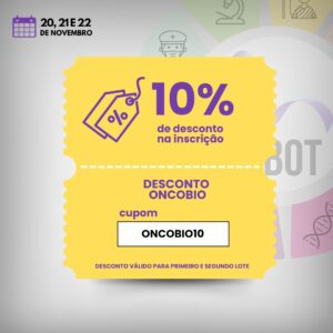 Membros e seguidores do Programa de Oncobiologia terão um desconto de 10% na inscrição utilizando o código do cupom compartilhado abaixo e em nossas redes sociais. (clique aqui para acessar nossas redes). As inscrições são feitas por lotes. Confira o site oficial do evento para mais informações.